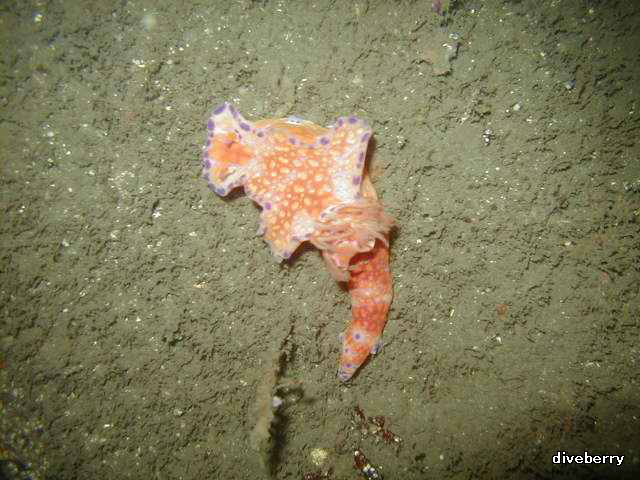 水温:20℃、気温:26℃、透明度:↑2〜3b・→2〜3b、流れアリ 今回はスタッフの調査で、初めて逗子のボートポイント『タツ根』へ潜ってきました。 水深は根頭で14b、最大水深で26メートル程度でした。 ロープ沿いに潜降していくと根頭でイシダイ成魚が私の横を数匹で通り過ぎていきました。 また、スズメダイ・ネンブツダイ・アジが根の周りに群れを作っており圧倒される景色です。 タツ根といわれるとおり根にはタツノオトシゴなど小物もたくさん見られるようです。 今回はタツノオトシゴは見つけられませんでしたが、ウミウシ類はたくさん見られました。 コモン・シロ・ニシキ・キイロイボ・ハナオトメ・アワシマオトメ・シラウメ・ アオなど見つけられましたよ。デジカメやマクロダイブの好きな方は絶対お勧めのポイントです。 |
